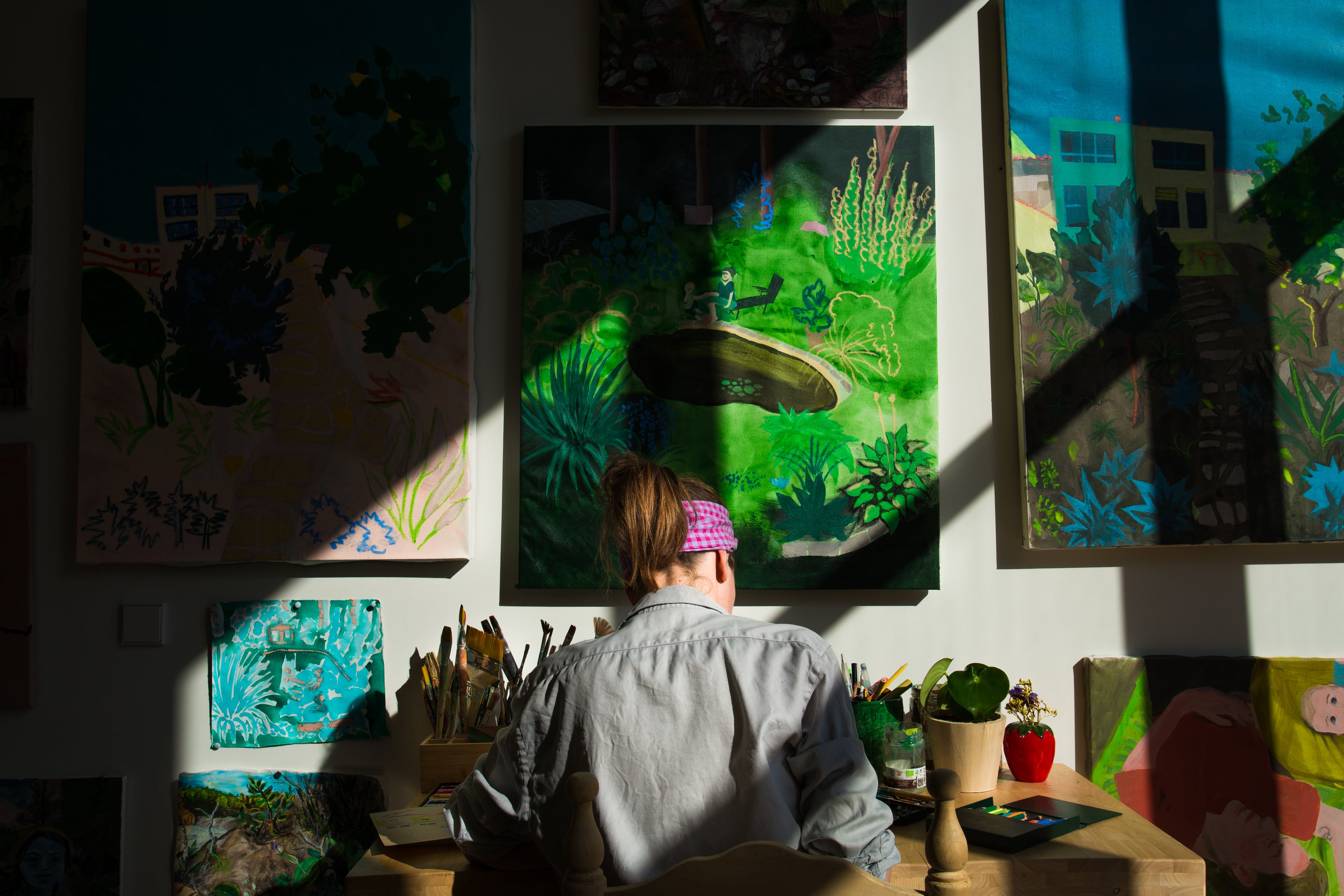Based in Barcelona, Ina is particularly drawn to the local flora, studying the moods and colors conveyed by the objects observed. The artist works on canvas using acrylic paint and oil sticks, starting to experiment with plant-based pigments. On paper, she uses oil pastels and colored pencils for their ability to layer, add texture, and create patterns.